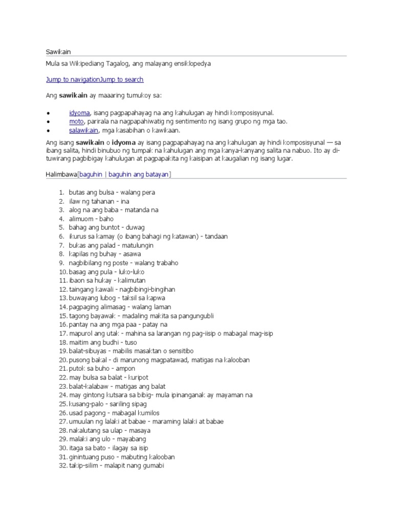Balitang kutsero patay gutom ilaw ng tahanan walang isang salita bantay salakay magdidil ng asin asot pusa magaan ang kamay higpitan ang kumot haligi ng tahanan nagsusunog ng kilay anak pawis may kutsarang pilak sa bibig may gatas pa sa labi kamay na bakal anak araw balat sibuyas balat kalabaw ningas kugon nagtaingang kawali di mahulugang karayom di maliparang uwak. Kahit nagsimula ka sa wala kapag ikaw ay meron pinag-aralan malaki ang pagkakataon na makaangat sa kahirapan. Idyoma - Ang isang sawikain o idyoma ay isang pagpapahayag na ang kahulugan ay hindi komposisyunal - sa ibang salita hindi binubuo ng tumpak na kahulugan ang mga kanya-kanyang salita na nabuo.